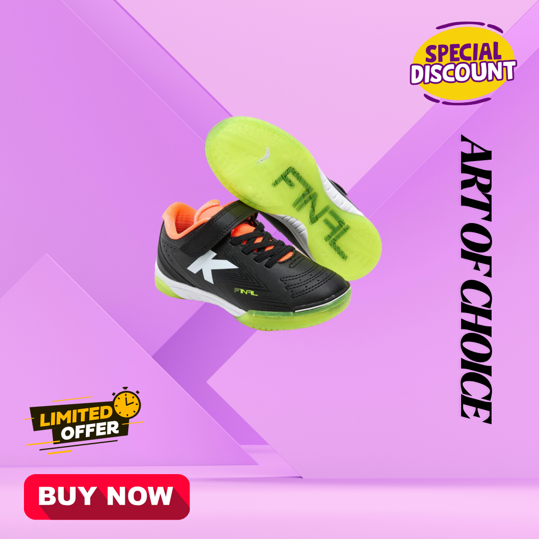 New design for the Final Indoor Elastic children’s indoor soccer shoes in black, the perfect shoe for their first adventures in indoor soccer. Designed with kids in mind, these shoes combine safety, comfort, and ease of use, so they can focus solely on enjoying the game.