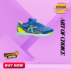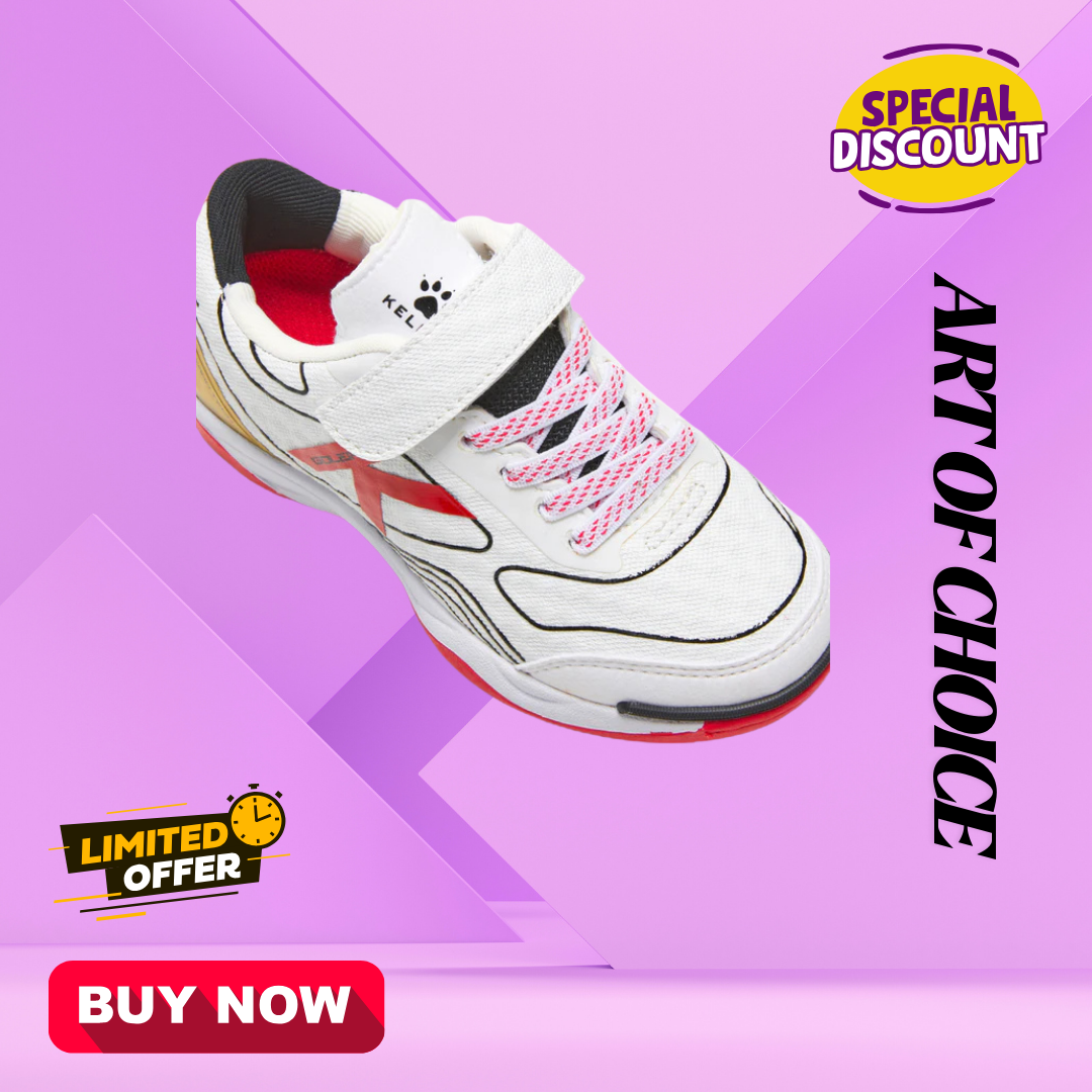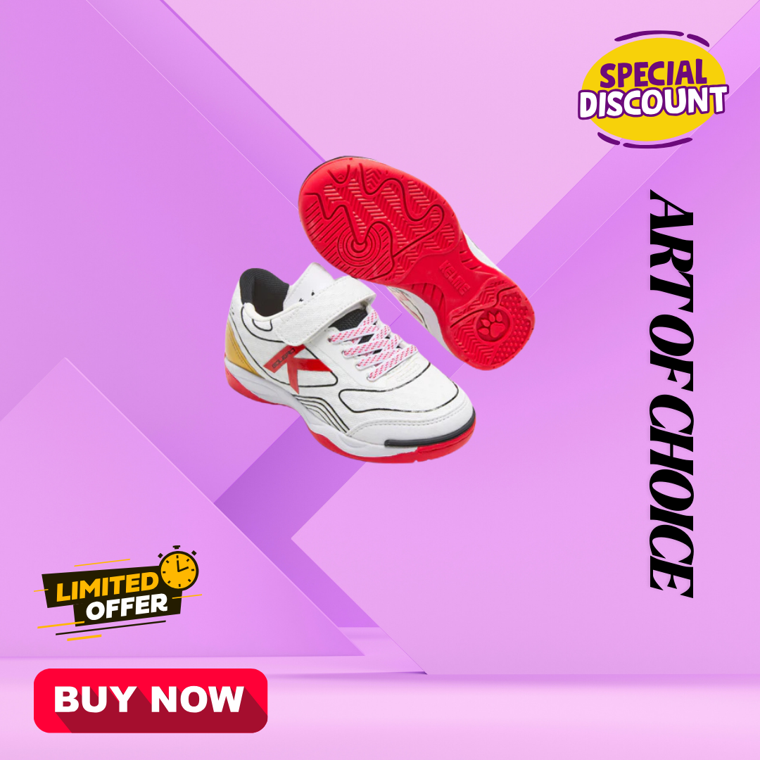 White indoor soccer shoes for children. A model designed for adults and developed exactly the same for younger players. Reinforced toe cap with perforations ensures great breathability, and a strap closure and laces ensure a secure fit.