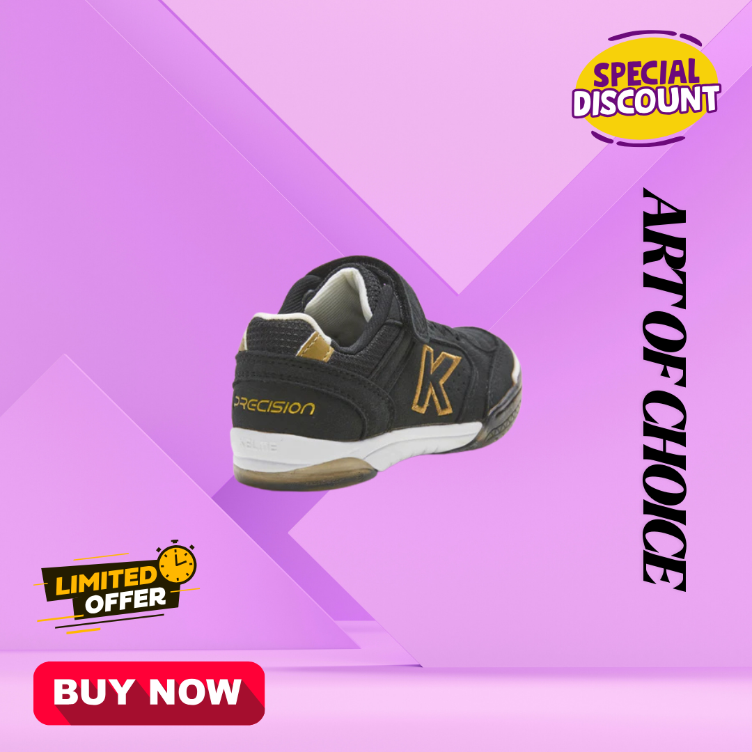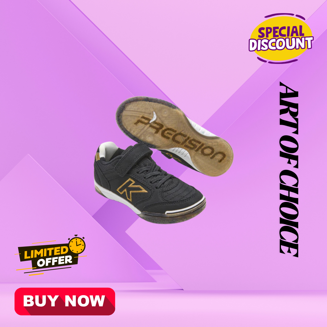 Kids’ indoor soccer shoes in black and gold. A truly indestructible shoe for the most innovative young players. The material is highly breathable and durable, and the sole is very flexible. It features a strap and lace closure to ensure a secure fit.
