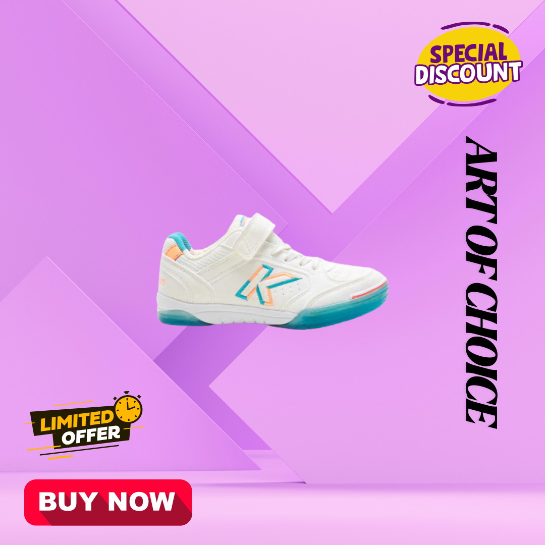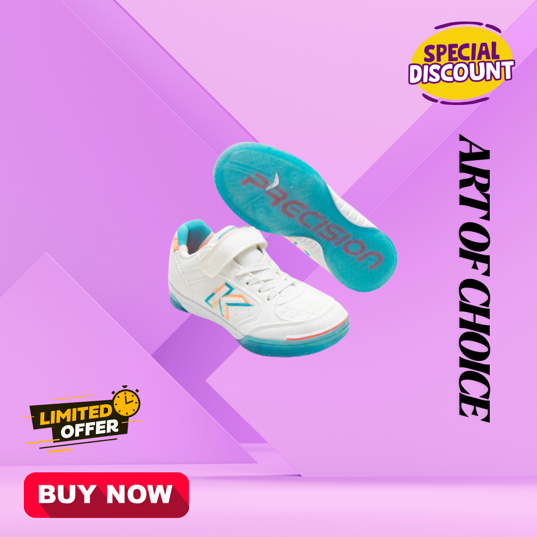 Kids’ indoor soccer shoes in white and turquoise. A truly indestructible shoe for the most innovative young players. The material is highly breathable and durable, and the sole is very flexible. It features a strap and lace closure to ensure a secure fit.