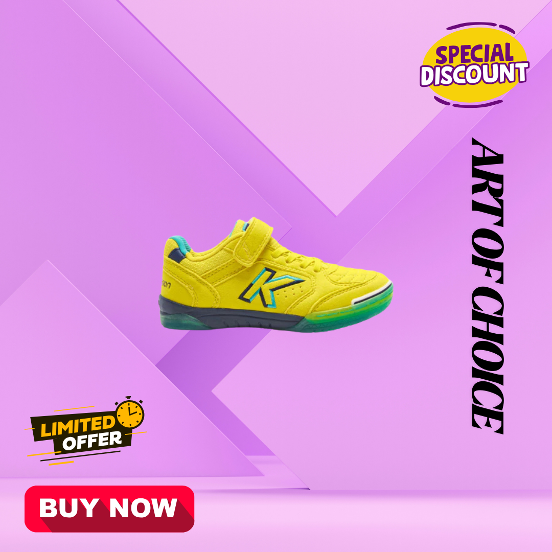Kids’ indoor soccer shoes in yellow and navy. A true indestructible shoe for the most innovative young players. The material is highly breathable and durable, and the sole is very flexible. It features a strap and lace closure to ensure a secure fit.